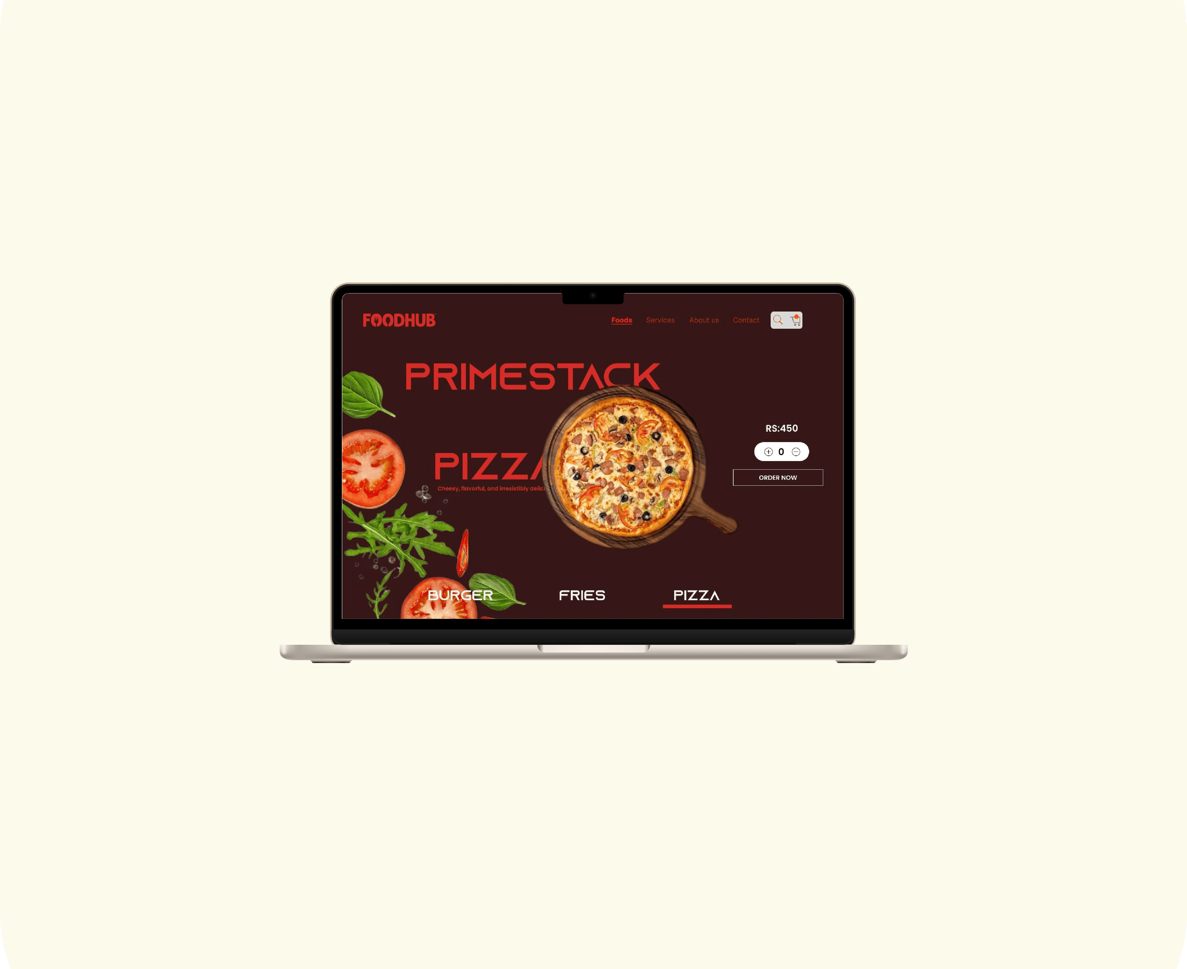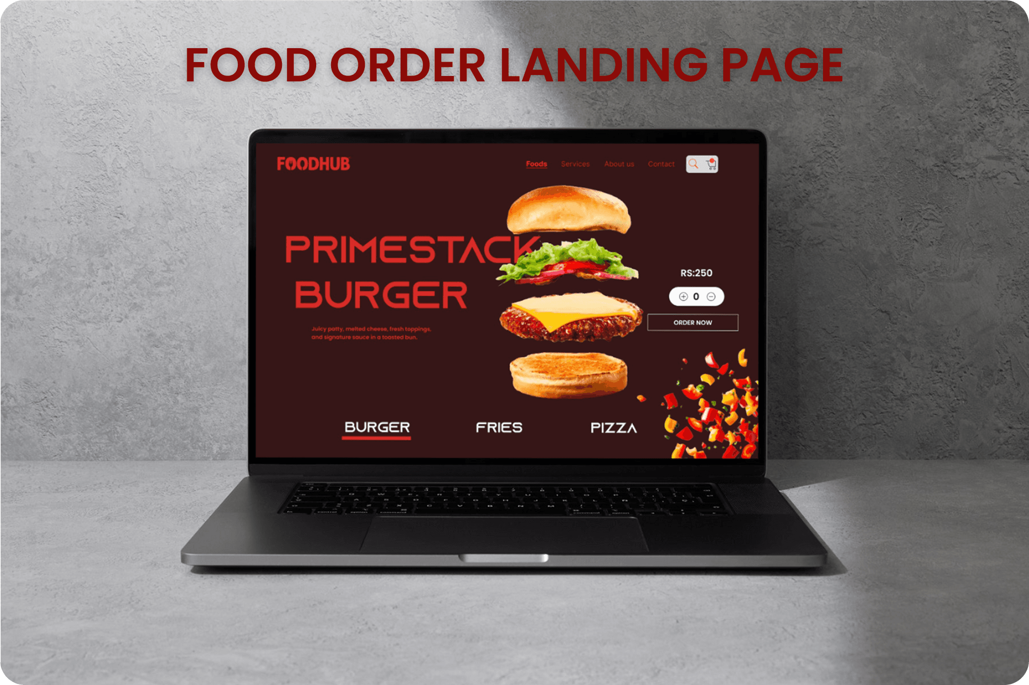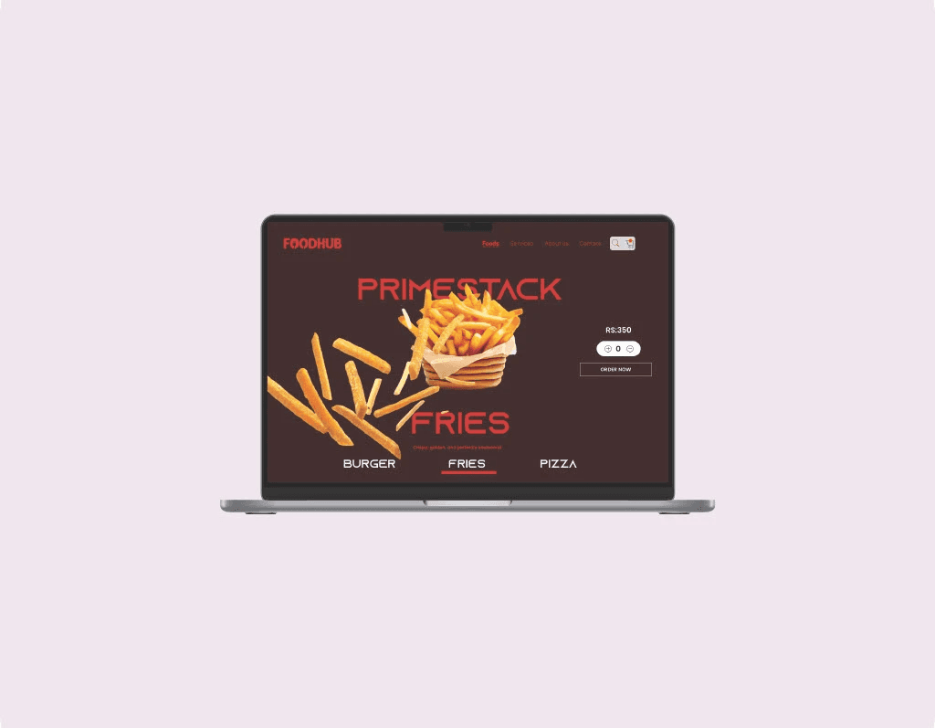 PrimeStack’s design combines bold visuals, smooth layout, and interactive motion to deliver a fun and intuitive ordering experience. Using Figma, I designed responsive screens with large food images, strong typography, and clear CTAs. The color palette includes warm tones like red, yellow, and brown to match the fast-food vibe and trigger appetite. Every section was kept minimal to reduce decision fatigue, while animations were added to bring the interface to life and create a more enjoyable journey from menu to checkout.